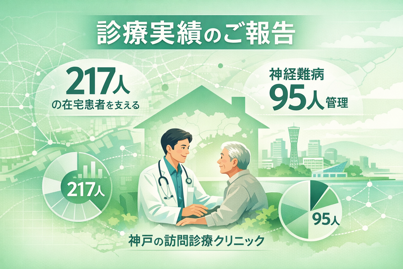 拠点は中央区・兵庫区・長田区。灘区・北区・東灘区・須磨区など市内全域へ訪問しています。女性59%、男性41%。小児在宅医療にも対応しています。